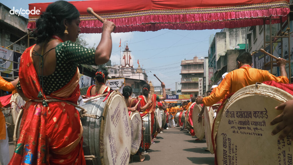 จากห้างร้านที่เต็มไปด้วยรูปปั้นของพระพิฆเนศวางขาย เมื่อเดินเข้าไปยังจุดศูนย์กลางของงานที่ Dagadusheth Halwai Ganapati Temple เสียงกลองดังสนั่นไปทั่วบริเวณ กลองถือว่าเป็นส่วนสำคัญของงานเทศกาลโดยเฉพาะในรัฐ Maharashtra ทุกเทศกาลที่สำคัญจะมีทีมตีกลองออกมาแสดง พวกเขาต้องแบกกลองขนาดใหญ่ และยืนกลางแจ้งตลอดทั้งวัน