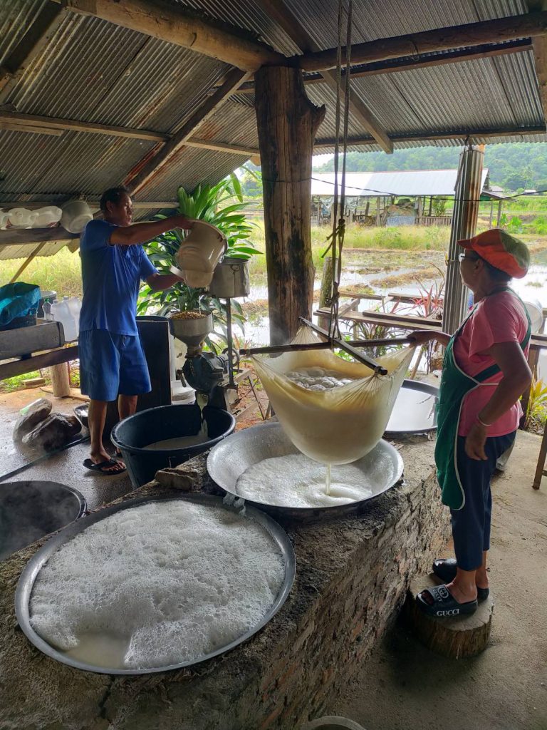 วันเดียวกันนี้ เรายังได้ไปดูสาธิตทำเต้าหู้ที่บ้านพี่ประสาน สุวรรณสังข์ บ้านกลางทุ่งที่เป็นโรงเต้าหู้ขนาดเล็ก ทำเต้าหู้จากถั่วเหลืองพันธุ์เชียงใหม่ 90 ที่ปลูกเองทั้งบนที่สูงและพื้นราบ กระบวนการทำไม่ซับซ้อน เริ่มจากแช่ถั่วไว้ 4–5 ชั่วโมง บดกับน้ำด้วยเครื่องบดไฟฟ้า กรองผ้าขาวบางเติมน้ำหลายครั้ง จนได้น้ำถั่วเหลืองที่ข้นพอเหมาะ ต้มในกระบะใหญ่บนเตาถ่าน พอเริ่มเดือด ตักใส่อ่างใหญ่ เติมน้ำส้มสายชู 5% กวนจนน้ำถั่วเหลืองเริ่มจับตัวข้นขึ้น จึงตักใส่พิมพ์ไม้ คลุมผ้า ทับน้ำหนักไว้ 1 วัน จะได้เต้าหู้เนื้อดี ไม่อ่อนไม่แข็งมากนัก