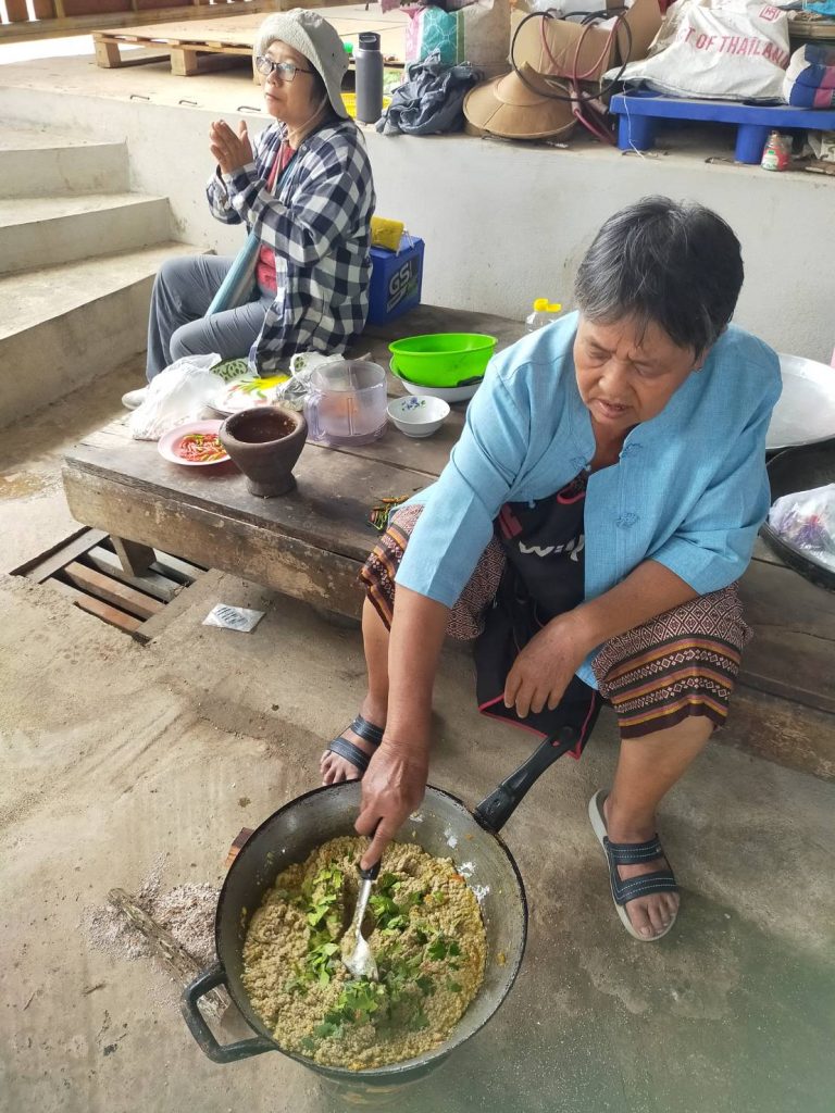 “เราต้องซ่อกพอให้แตก ถ้าตำในครก เมล็ดมันจะแตกไปเลย แล้วฝัดเปลือกออกไม่ได้ พอตำฝัดได้เนื้อถั่วแล้ว เอาไป ‘ขื่อ’ คือต้มนาน ๆ ให้สุก ใส่เนื้อหมูนิดหน่อย หรือจะใช้ปลาแห้ง กุ้งแห้งก็ได้” พี่บุญศรีเล่าวิธีทำอย่างละเอียด เพราะว่าเธอกำลังสาธิตให้นักท่องเที่ยวอย่างพวกเรารับรู้ขั้นตอนซึ่งกินเวลานาน เธอจึงต้มถั่วส่วนใหญ่จนเปื่อยนุ่มไว้ก่อนแล้ว