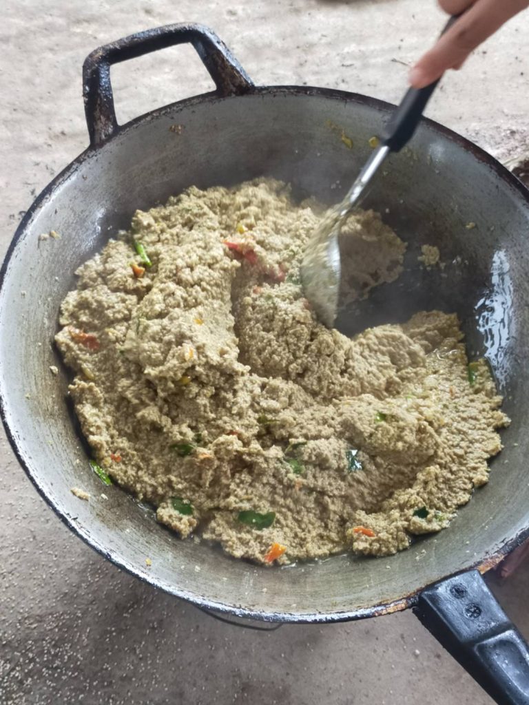 จากนั้นต้องทำพริกตำ พี่บุญศรีตำพริกป่น เกลือ กะปิ กระเทียม หอมขาว ถั่วเน่าผงจนเข้ากันดี บดลูกมะเขือส้มพันธุ์พื้นเมืองหยาบ ๆ ใส่ผสม จากนั้นเอาลงผัดในกระทะน้ำมันจนหอม เอามาเทใส่หม้อต้มถั่ว ใส่หมูย่างหั่นชิ้น ขิงตำ ต้นหอมผักชีซอย