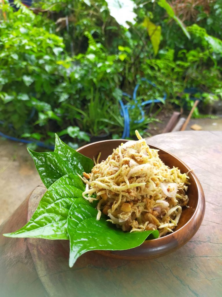 ที่จริงพี่บุญศรียังสาธิตทำกับข้าวอีกหลายอย่างให้พวกเราชิม มี“ยำเต้าหู้” ใช้เต้าหู้ของพี่ประสานนั่นเอง ยำกับหมูสับลวกนิดหน่อย ให้รสสดชื่นโปร่งเบามาก ๆ มี“มะม่วงซะน่าบ” ใช้มะม่วงเขียวเสวยจะดีที่สุด สับซอยเป็นเส้น คลุกกับกระเทียมตำกะปิแล้วคั่วกระทะน้ำมัน กุ้งแห้งตำหยาบคั่วน้ำมัน หอมแดงซอย ถั่วลิสงและงาขาวคั่วบดหยาบ พริกป่น ขยำเคล้าให้เข้ากัน ลักษณะเป็นยำแห้งหมาด ๆ รสชาติเบา ๆ แต่ซับซ้อน