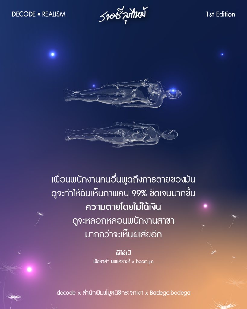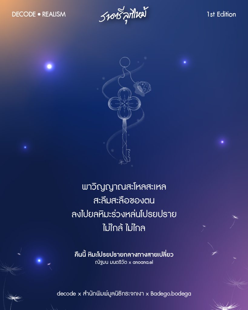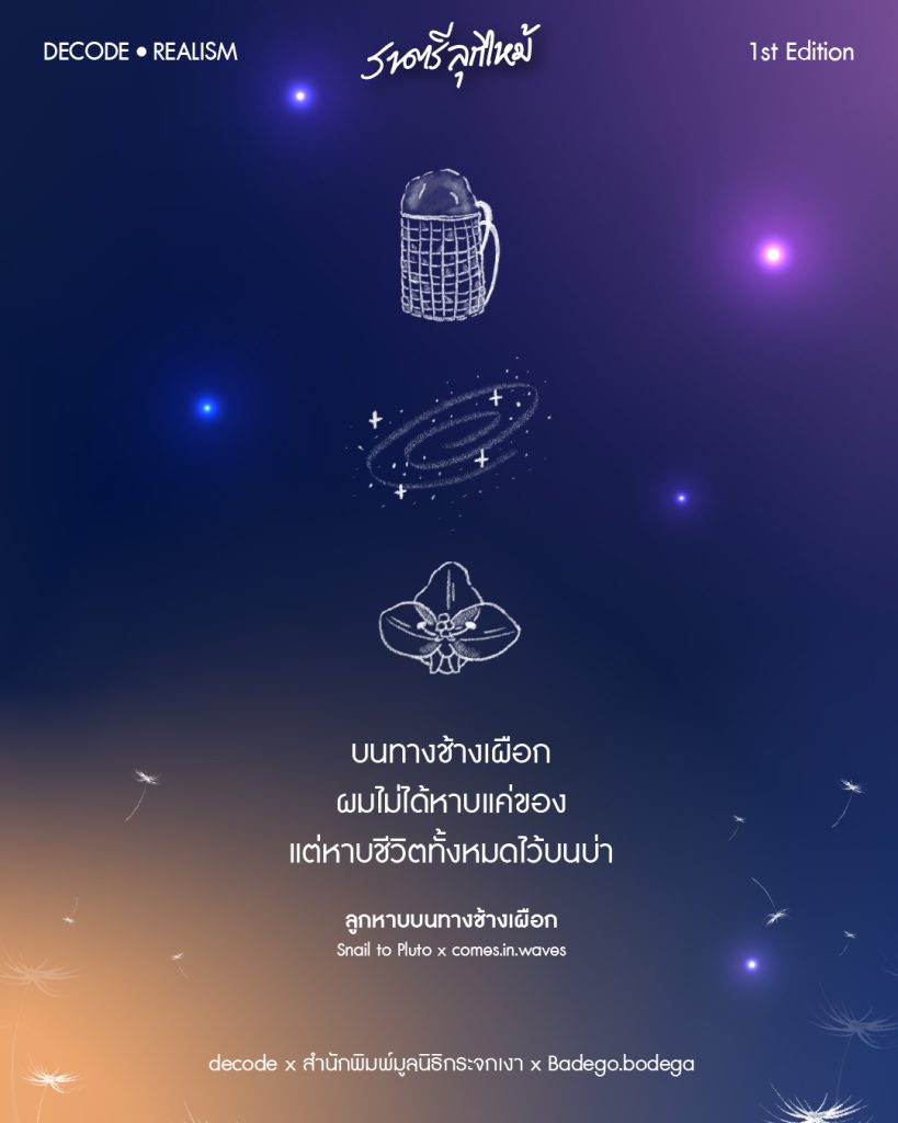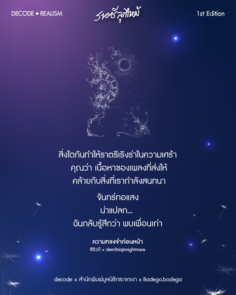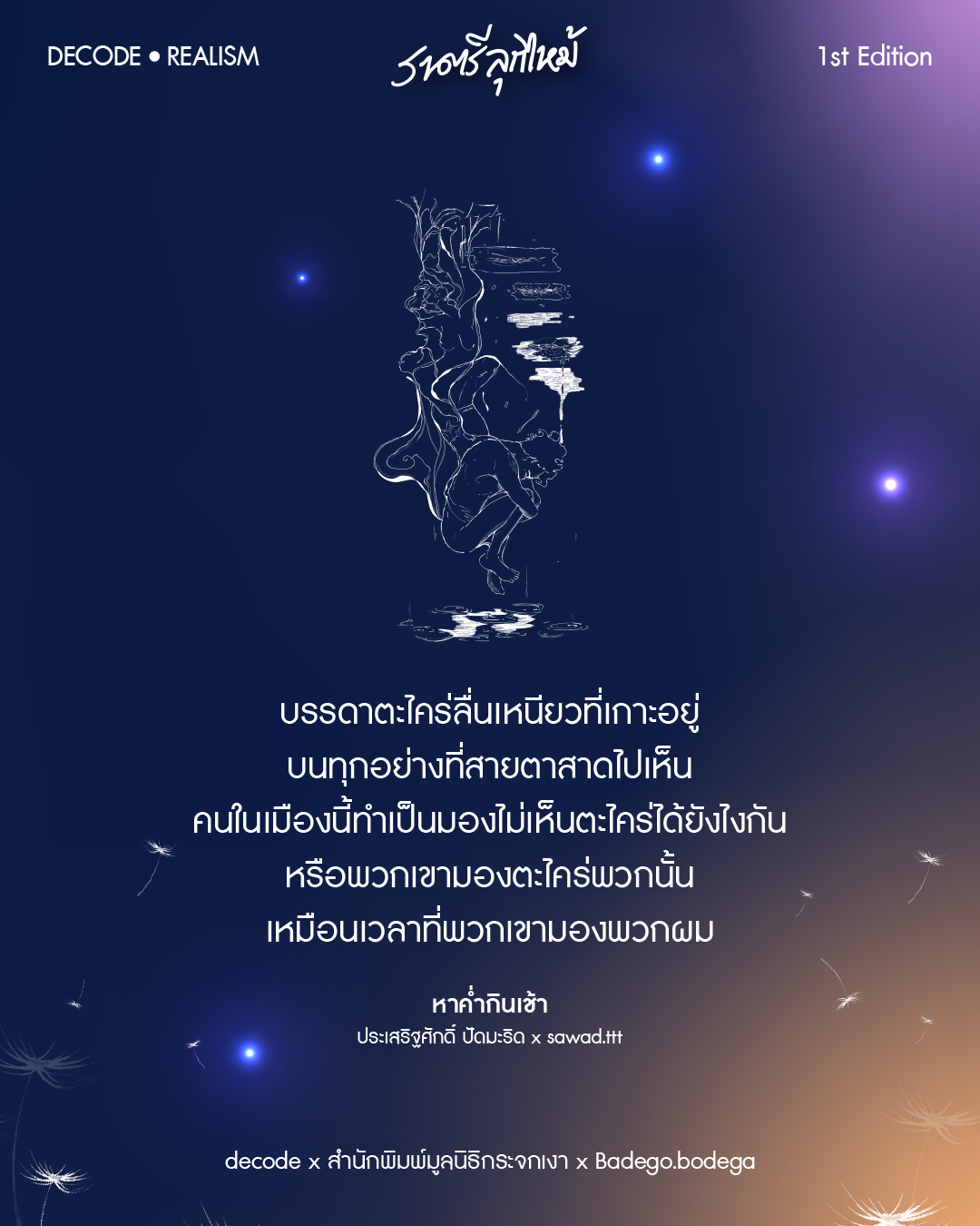เช่นเดียวกันในวันนี้ที่งานสักได้มาพบเจอกับงานเขียนในโพรเจกต์ ราตรีลุกไหม้ หนังสือรวมเรื่องสั้น บทความและบทกวีจาก 19 นักเขียน ‘ยามวิกาล’ ถ้อยคำระหว่างบรรทัดของนักเขียน ถูกขยายเรื่องราวเคล้าไปกับน้ำหมึกจากปลายเข็มของ 5 ศิลปิน tattoo ในชุมชนของ Badego.bodega เช่นกัน