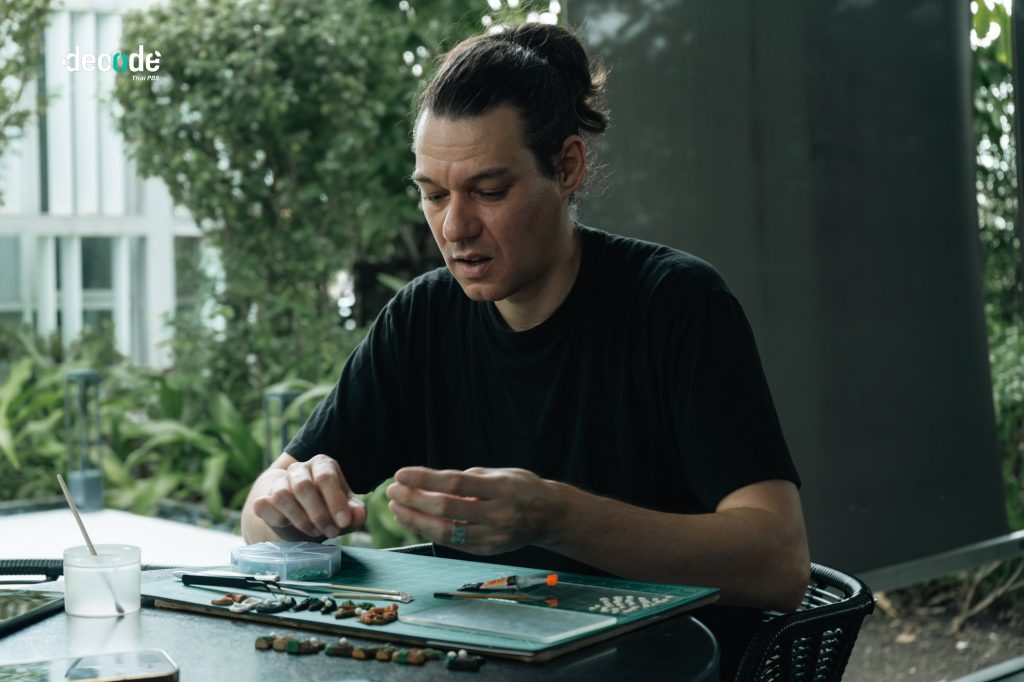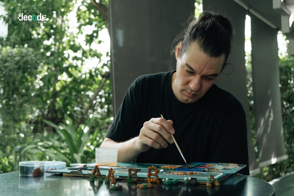 เมื่อถามว่า อยู่กับการปั้นได้นานแค่ไหน เขาตอบทันที “ผมสามารถอยู่กับมันได้ทั้งวัน แบบลืมเวลา ไม่กิน ไม่เข้าห้องน้ำ โฟกัสกับมันมากจริง ๆ”