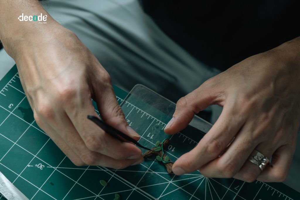 กลิ่นดินอบอวล มือและสายตาสอดประสาน แน่วแน่ จดจ่อกับชิ้นส่วนเล็กจิ๋วกว่าฝ่ามือค่อย ๆ ปรากฏเป็นรูปร่างของดอกไม้และถ้อยคำ แผ่วเบาราวกับชิ้นส่วนเหล่านั้นคือทุกสิ่งทุกอย่างของ อาร์นู อดีตช่างทำเฟอร์นิเจอร์จากเนเธอร์แลนด์ ดินก้อนเล็ก ๆ ในมือเขาค่อย ๆ กลายเป็นใบไม้ ดอกหญ้า กระทั่งเป็นบ้านหลังเล็ก ๆ ที่มีชีวิต มันจึงไม่ใช่แค่งานฝีมือ แต่คือพื้นที่ที่เขาได้กลับเข้าไปภายในตนเอง
