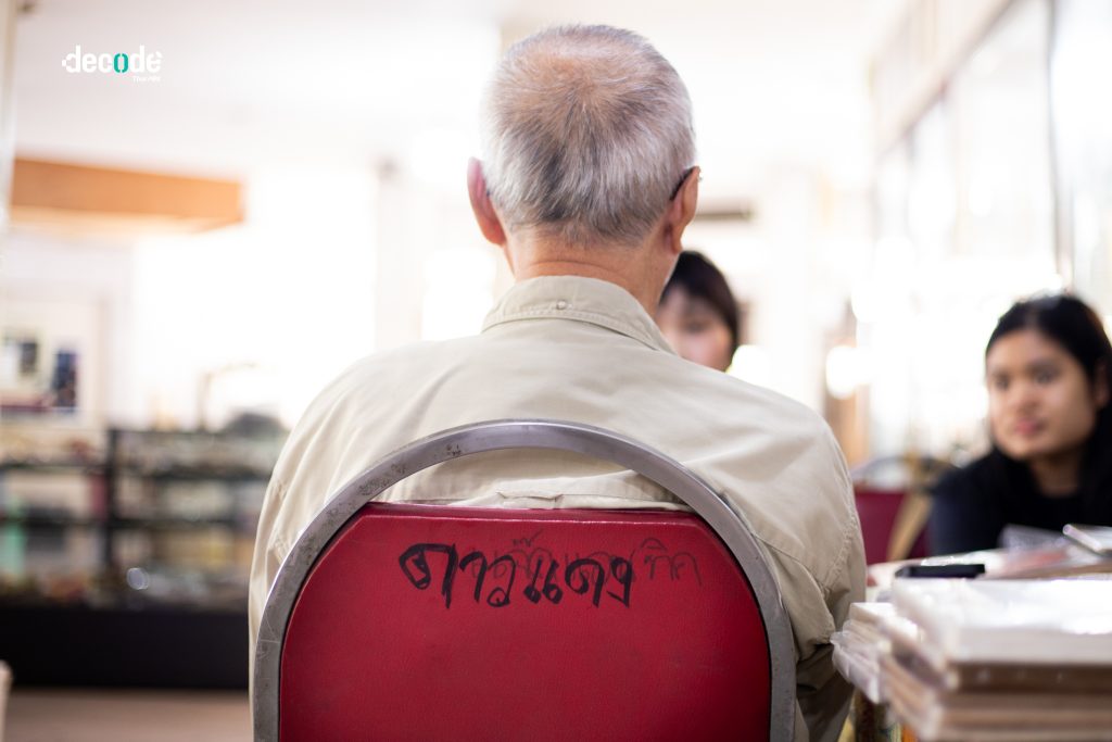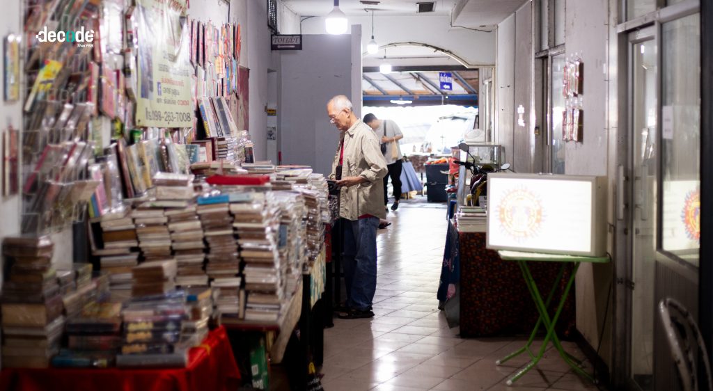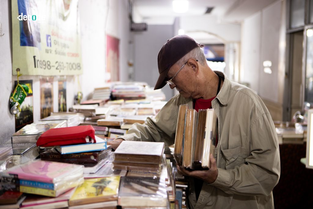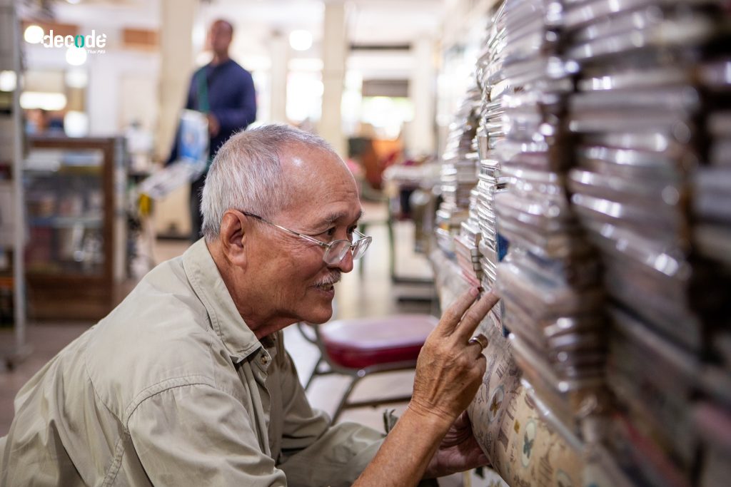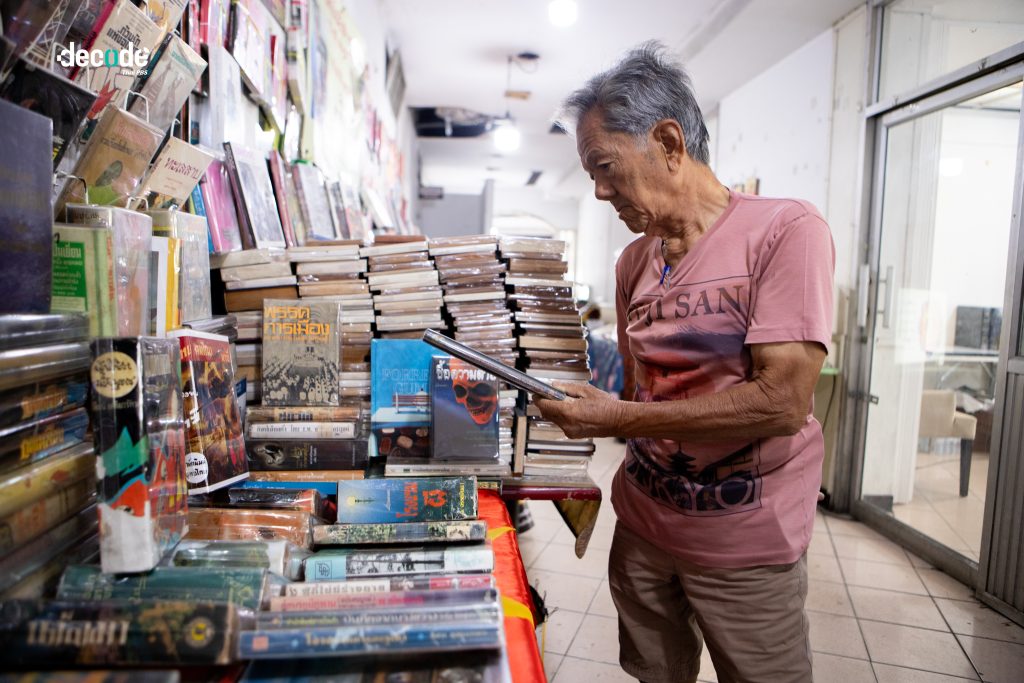 พูดด้วยหน้าตายิ้มแย้มพร้อมเล่าที่มา ตรงนี้คนผ่านไปผ่านมาเยอะดี ลุงไม่ค่อยชอบเรียงใส่ในพวกตู้ใส่มันเบ็ดเสร็จไป แบบนี้ลุงจะได้มาจับหนังสือบ่อย ๆ จัดเรียงเองทุกเล่ม ชอบให้คนมารื้อ ๆ ค้น ๆ ดู ให้คนได้ใช้เวลากับมัน บางเล่มที่เขาไม่เคยเห็นมันก็จะผ่านตา บางคนอยู่เป็นชั่วโมง คนมาดูลุงก็มีกำลังใจ มีคนมาคุยเล่นด้วย
