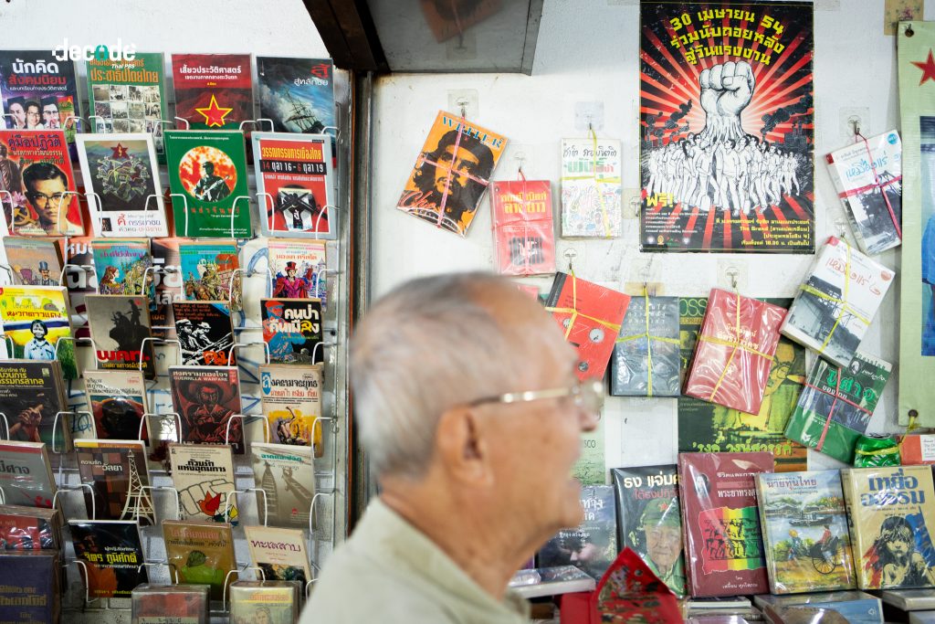 ในตึกเก่าย่านตลาด อตก. ร้านขายของเก่าและกรุสมบัติของนักล่าพระเครื่อง ตามทางเดินที่อบอวลไปด้วยกลิ่นพริกกระเทียมจากร้านอาหารตามสั่ง คนพลุกพล่านจอแจ เสียงเหรียญกระทบถาดสแตนเลสจากแถวหน้าห้องน้ำสาธารณะ หากเดินเลยไปอีกไม่กี่ก้าว ก่อนจะถึงประตูห้องน้ำ จะมีแผงเล็ก ๆ แน่นไปกองหนังสือมือสองวางซ้อนกันเป็นชั้น ๆ ที่ถูกจัดวางลงอย่างดี วรรณกรรมเก่า หนังสือการเมืองและประวัติการต่อสู้ของชนชั้น ในร้านหนังสือเก่า ดาวแดง