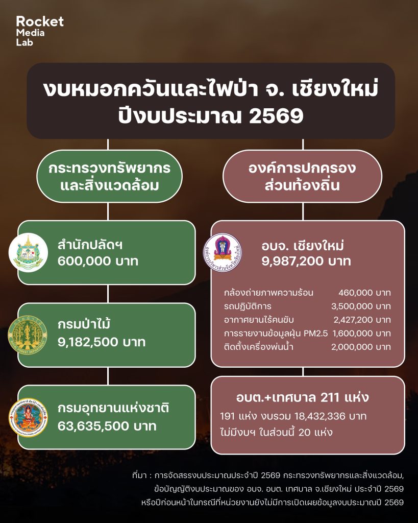 เมื่อพิจารณางบที่เกี่ยวข้องกับการจัดการไฟป่าจากองค์กรปกครองส่วนท้องถิ่น ในส่วนของ อบจ.เชียงใหม่นั้นตั้งงบในปี 2569 ไว้ที่ 9,987,200 บาท แบ่งเป็น