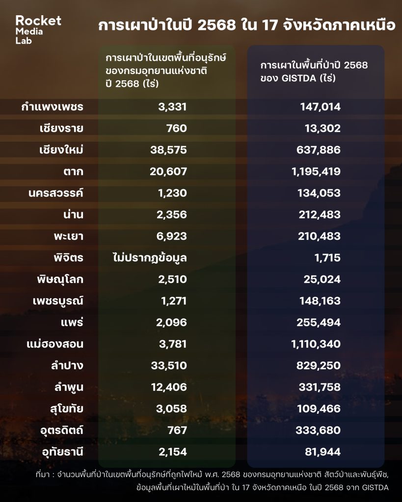 ในขณะเดียวกัน หากพิจารณาควบคู่กับข้อมูลพื้นที่เผาไหม้ จากข้อมูลของกรมอุทยานแห่งชาติ สัตว์ป่าและพันธุ์พืช พบว่าในปี 2568 เชียงใหม่เป็นจังหวัดที่มีพื้นที่ป่าในเขตอนุรักษ์ถูกไฟไหม้สูงที่สุดทั้งในระดับประเทศและใน 17 จังหวัดภาคเหนือ ที่ 38,575.3 ไร่ ขณะที่อุตรดิตถ์มีพื้นที่ถูกเผาน้อยที่สุดใน 17 จังหวัดภาคเหนือเพียง 767 ไร่
