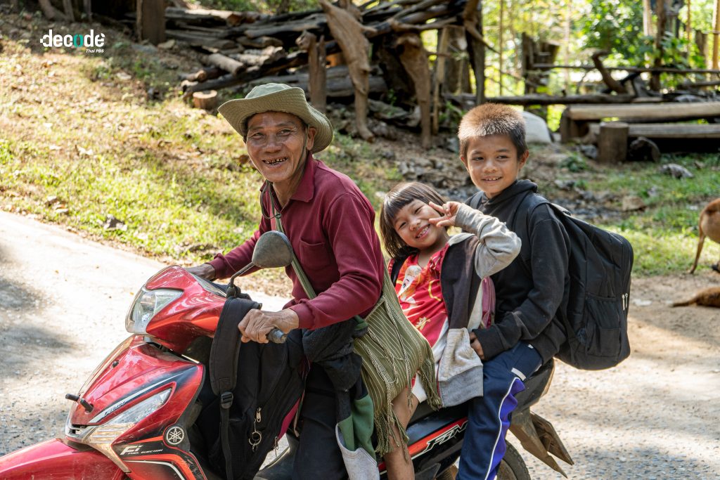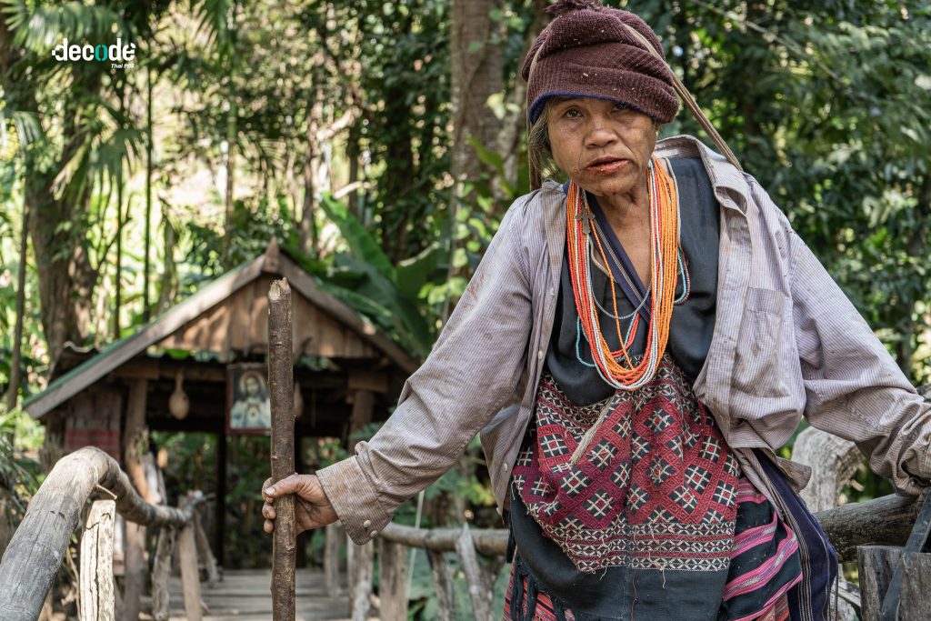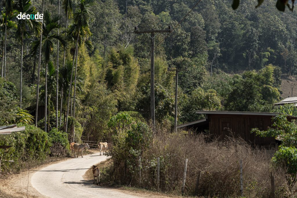 เราเดินพูดคุยกันไปเรื่อย ๆ บทสนทนาดำเนินไปพร้อมกับฝุ่นทางและจังหวะก้าวเท้า พี่สะท้าน ไกด์นำทางจำเป็นของเรา ก็สวมหมวกบทบาทใหม่ขึ้นมาอย่างไม่ได้ประกาศตัว นอกจากจะเป็นไกด์ เป็นผู้เล่าเสริมข้อมูลในพื้นที่ ล่าสุดเขายังเป็น ‘ล่ามภาษากะเหรี่ยงเฉพาะกิจ’ ที่คอยประคองให้เรื่องราวของผู้คนที่เดินผ่านไหล่พวกเราไปถูกเข้าใจอย่างไม่มีพร่อง