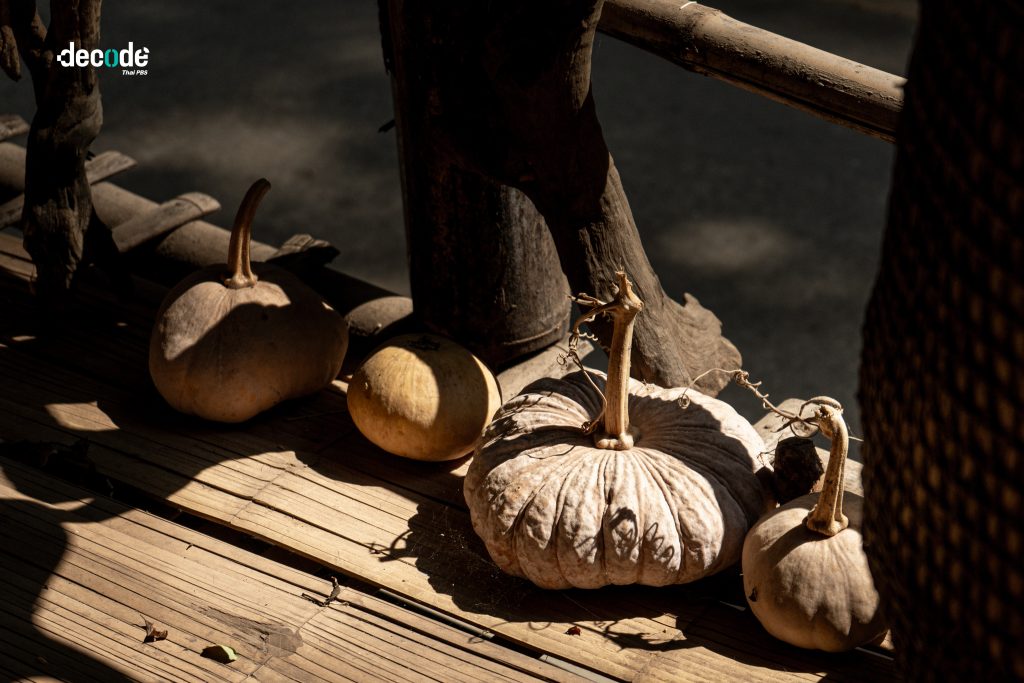 ระหว่างยืนชมผลงานของศิลปินกลางพื้นที่อุทยานเตรียมการฯ ที่รอวันประกาศเขตป่าแห่งใหม่ ซึ่งแน่นอนว่าไม่ได้ทำให้ชาวบ้านใช้ชีวิตได้ง่ายขึ้น ก็เหลือบไปเห็นคุณยายแต่งกายด้วยเสื้อผ้าชนพื้นเมือง สะพาย ‘กือ’ (ตะกร้าเก็บพืชผลต่าง ๆ ที่ชาวกะเหรี่ยงมักใช้สะพายหลัง) กำลังเดินข้ามสะพานมายังจุดที่พวกเรายืนอยู่ แกกวักมือเรียกพี่สะท้านพร้อมกับวางกือ หยิบฟักทอง และพริกกะเหรี่ยงอีกหนึ่งโกยพูน ๆ ใส่มือพี่สะท้าน